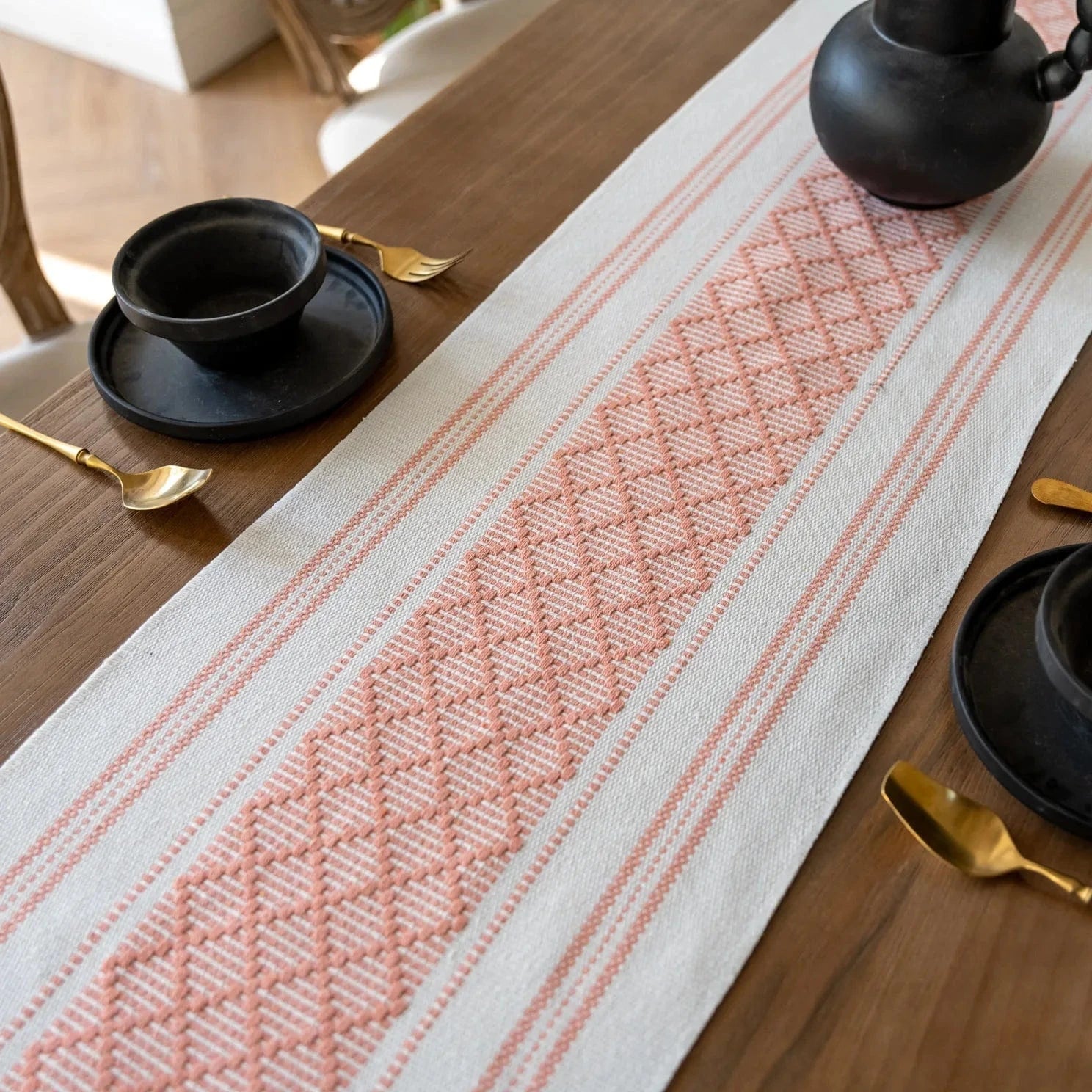 Le détail des motifs contribuent à faire de ce chemin de table un choix incontournable pour ceux qui apprécient le style bohème chic. L’élaboration soignée de chaque motif losange témoigne d’une élégance discrète, idéale pour ceux qui désirent introduire une note poétique et paisible dans leur espace de vie.
