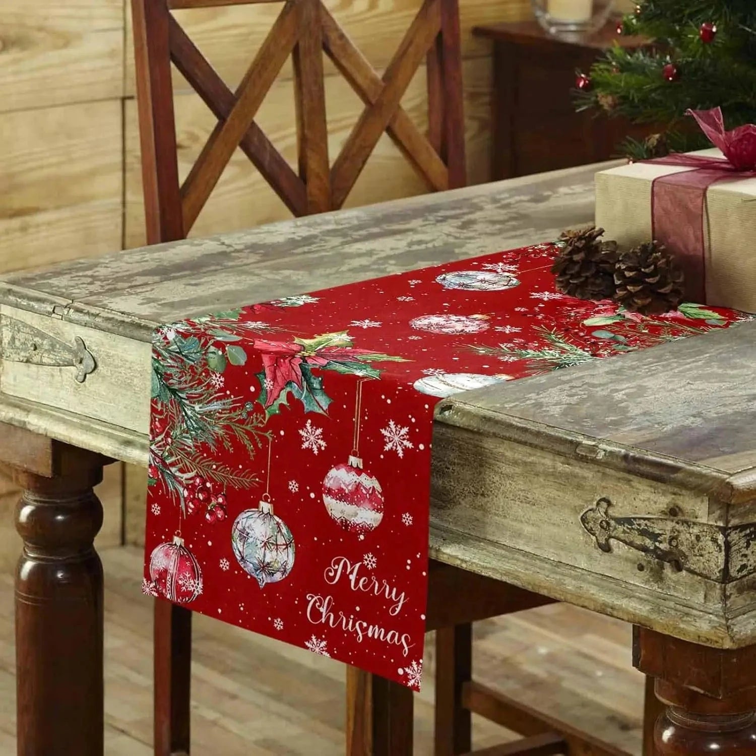 Décorez vos fêtes avec le Chemin de Table Boules de Noël – Merry Christmas Lin Rouge, élégance garantie!