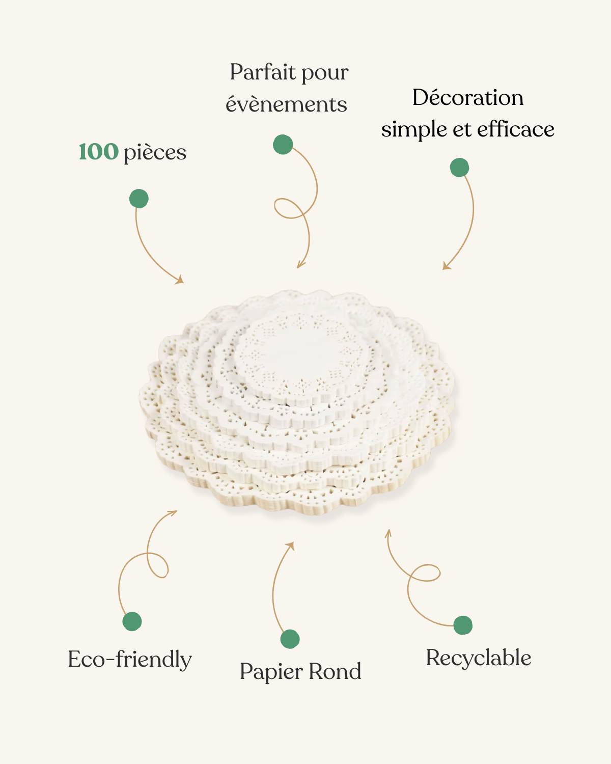 Ce lot de 100 napperons ronds est parfait pour les grandes réceptions comme pour les petits rassemblements. Grâce à sa bordure festonnée distinctive, il confère une finition élégante à votre table. La diversité des tailles proposées dans ce lot vous assure d’avoir toujours la bonne option à portée de main, quelle que soit la taille de vos plats.