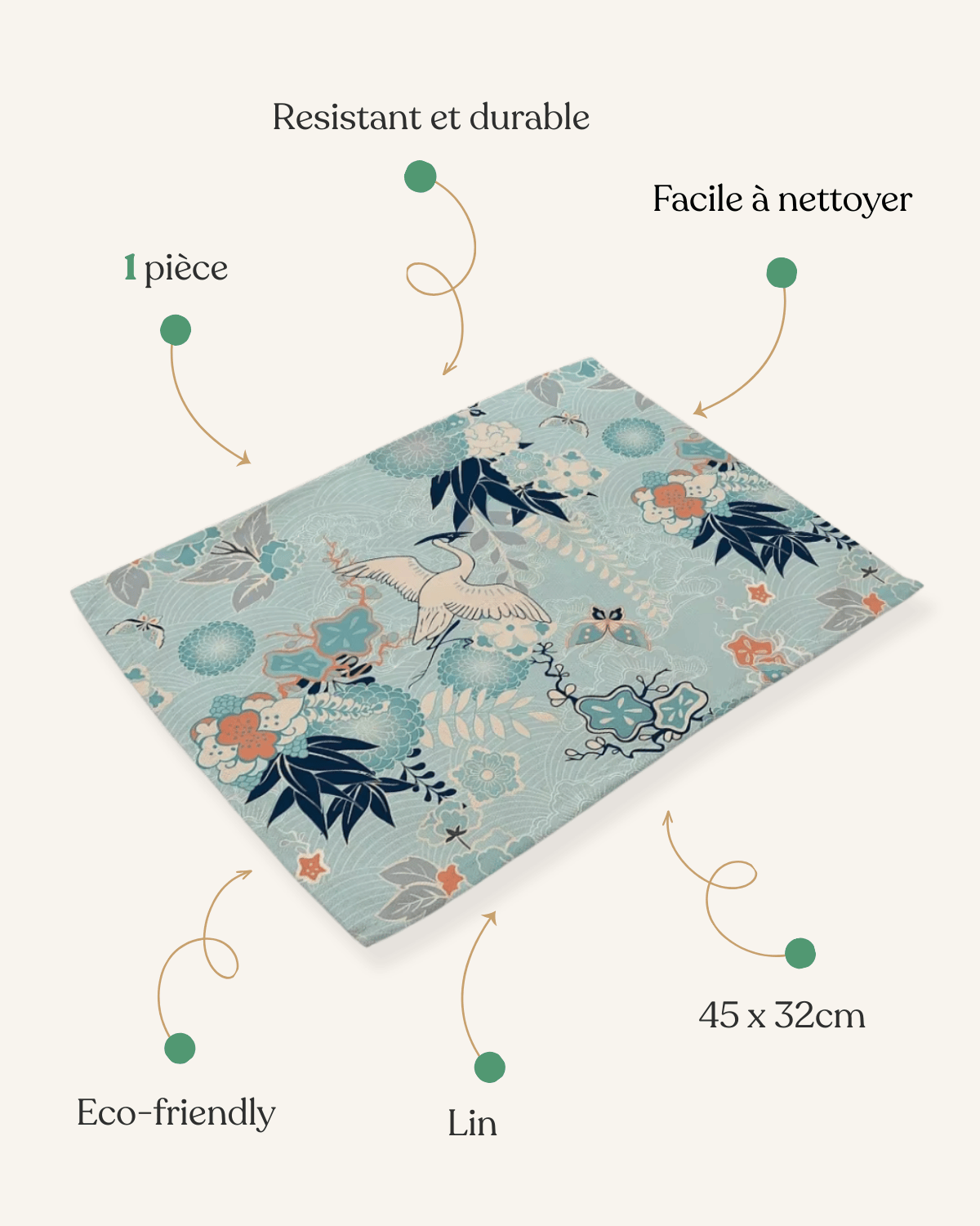 Chaque détail de ce set de table évoque une ambiance sereine. Les grues tsuru qui le décorent ne sont pas seulement symboliques de longévité au Japon, mais elles apportent aussi une note poétique et méditative à votre salle à manger. Plongez dans la tranquillité et le raffinement asiatique.