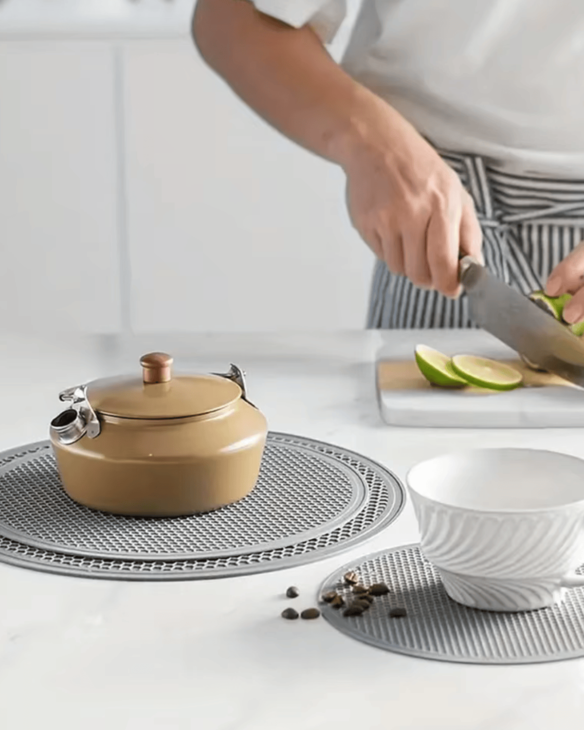 Avec sa texture alvéolée antidérapante, le Set de Table Pas Cher Silicone – Rond 25cm 4 Coloris assure une stabilité parfaite de la vaisselle. Finies les assiettes glissantes, vous pouvez désormais savourer vos repas en toute tranquillité. Un atout indispensable pour les familles animées.